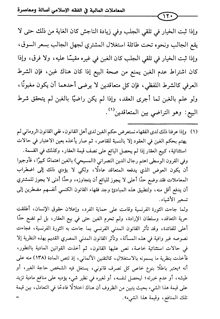 ولما جاءت الثورة الفرنسية وقامت على حماية الفرد، وإعلان حقوق الإنسان، أطلقت حرية التعاقد، وسلطان الإرادة، ولم تحرم الغبن حتى في بيع العقار، بل لم تضع حدًا أعلى للفائدة، وقد تأثر القانون المدني الفرنسي بما جاءت به الثورة الفرنسية، فجاءت نصوصه غير وافية في هذه المسألة، وتأثر القانون المدني المصري القديم بهذه النظرية إلا في حالات استثنائية خاصة، نص عليها القانون، ثم أخذت القوانين المادية بالتطور، فأخذت بنظرية ما يسمونه بالاستغلال، كالتقنين الألماني، إذ تنص المادة (١٣٨) منه على أنه "يعتبر باطلاً بنوع خاص كل تصرف قانوني، يستغل فيه الشخص حاجة الغير، أو طيشه، أو عدم خبرته؛ ليحصل لنفسه، أو لغيره في نظير شيء يؤديه على منافع مادية تزيد على قيمة هذا الشيء بحيث يتبين من الظروف أن هناك اختلالاً فادحًا في التعادل، بين قيمة تلك المنافع، وقيمة هذا الشيء". =