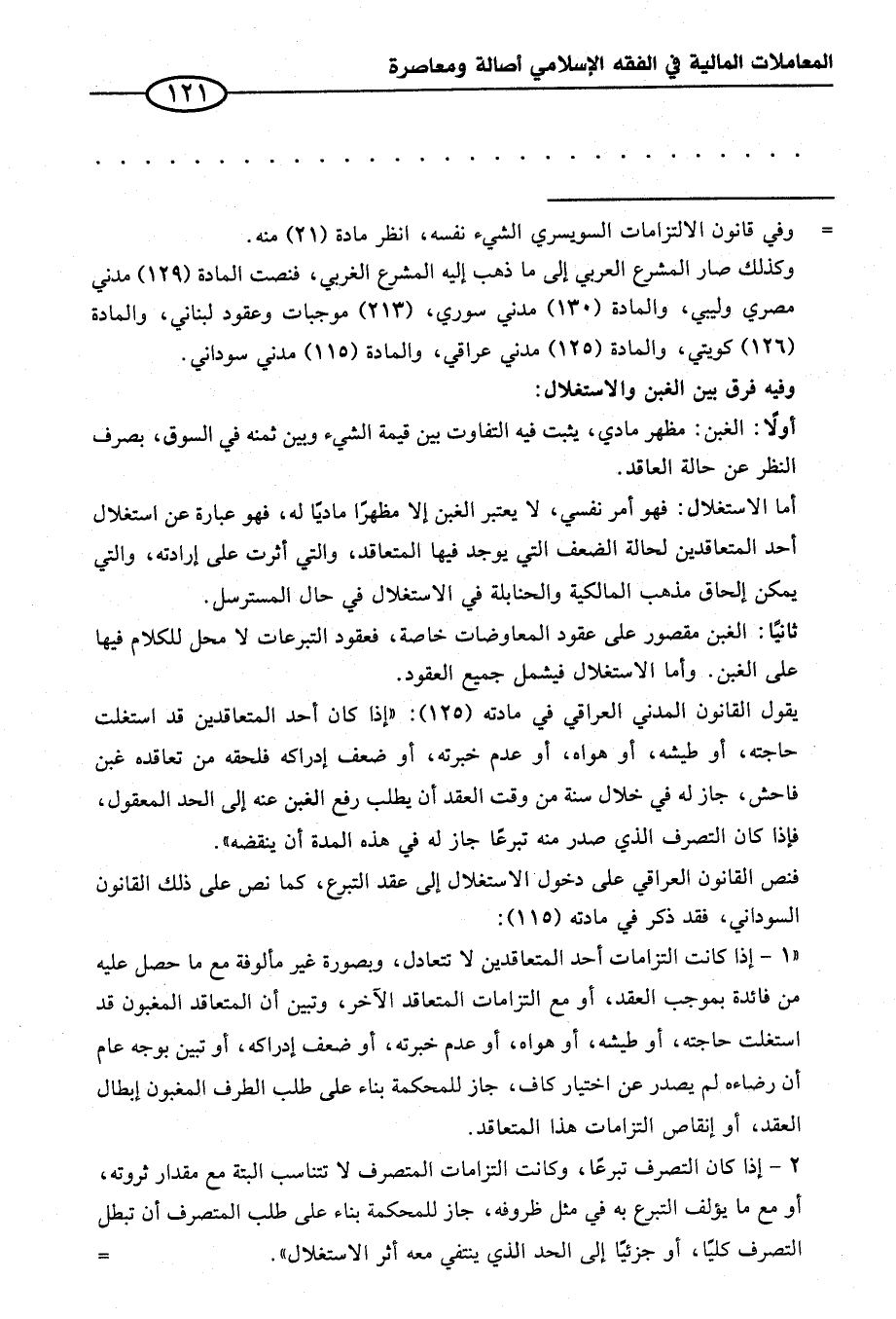 يقول القانون المدني العراقي في مادته (١٢٥): "إذا كان أحد المتعاقدين قد استغلت حاجته، أو طيشه، أو هواه، أو عدم خبرته، أو ضعف إدراكه فلحقه من تعاقده غبن فاحش، جاز له في خلال سنة من وقت العقد أن يطلب رفع الغبن عنه إلى الحد المعقول، فإذا كان التصرف الذي صدر منه تبرعًا جاز له في هذه المدة أن ينقضه".