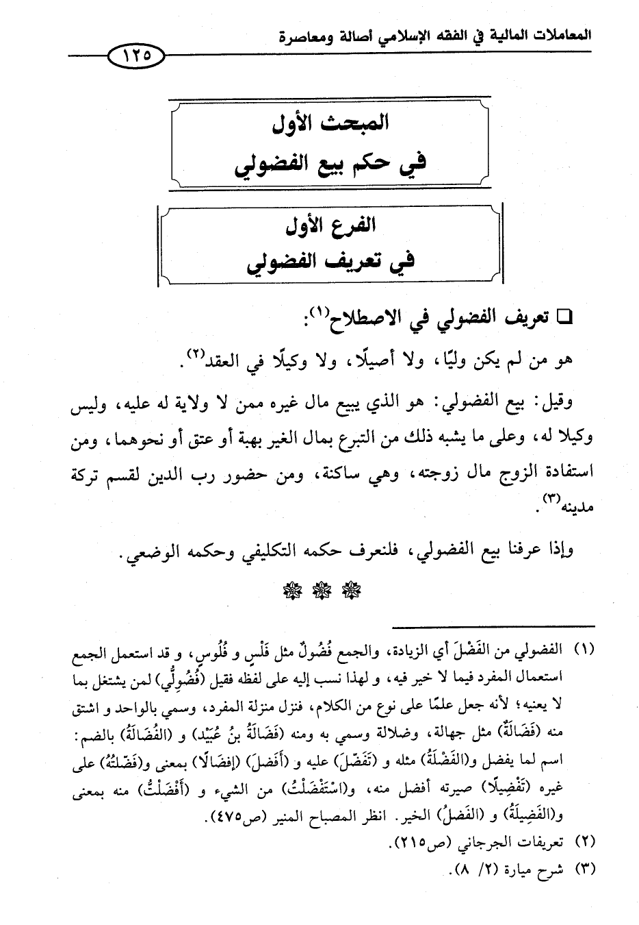 (¬١) الفضولي من الفَضْلَ أي الزيادة، والجمع فُضُولٌ مثل فَلْسٍ وفُلُوسٍ، وقد استعمل الجمع استعمال المفرد فيما لا خير فيه، ولهذا نسب إليه على لفظه فقيل (فُضُولِيُّ) لمن يشتغل بما لا يعنيه؛ لأنه جعل علمًا على نوع من الكلام، فنزل منزلة المفرد، وسمي بالواحد واشتق منه (فَضَالَةٌ) مثل جهالة، وضلالة وسمي به ومنه (فَضَالَةُ بنُ عُبَيْد) و (الفُضَالَةُ) بالضم: اسم لما يفضل و (الفَضْلَةُ) مثله و (تَفَضّلَ) عليه و (أَفَضلَ) (إفضَالاً) بمعنى و (فَضّلتُهُ) على غيره (تَفْضِيلاً) صيرته أفضل منه، و (اسْتَفْضَلْتُ) من الشيء و (أَفْضَلْتُّ) منه بمعنى و (الفَضِيلَةُ) و (الفَضلُ) الخير. انظر المصباح المنير (ص ٤٧٥).
