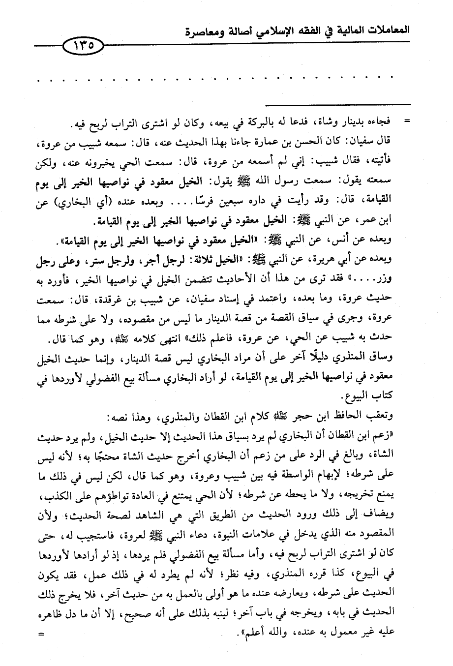 قال سفيان: كان الحسن بن عمارة جاءنا بهذا الحديث عنه، قال: سمعه شبيب من عروة، فأتيته، فقال شبيب: إني لم أسمعه من عروة، قال: سمعت الحي يخبرونه عنه، ولكن سمعته يقول: سمعت رسول الله - صلى الله عليه وسلم - يقول: الخيل معقود في نواصيها الخير إلى يوم القيامة، قال: وقد رأيت في داره سبعين فرسًا .... وبعده عنده (أي البخاري) عن ابن عمر، عن النبي - صلى الله عليه وسلم -: الخيل معقود في نواصيها الخير إلى يوم القيامة.