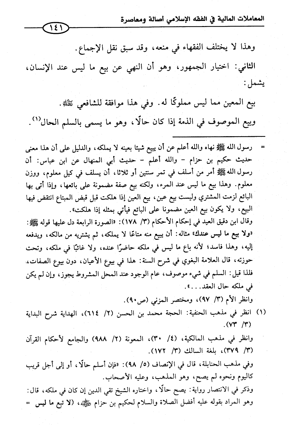 = رسول الله - صلى الله عليه وسلم - نهاه والله أعلم عن أن يبيع شيئا بعينه لا يملكه، والدليل على أن هذا معنى حديث حكيم بن حزام - والله أعلم - حديث أبي المنهال عن ابن عباس: أن رسول الله - صلى الله عليه وسلم - أمر من أسلف في تمر سنتين أو ثلاثا، أن يسلف في كيل معلوم، ووزن معلوم. وهذا بيع ما ليس عند المرء، ولكنه بيع صفة مضمونة على بائعها، وإذا أتى بها البائع لزمت المشتري وليست بيع عين، بيع العين إذا هلكت قبل قبض المتاع انتقض فيها البيع، ولا يكون بيع العين مضمونا على البائع فيأتي بمثله إذا هلكت".