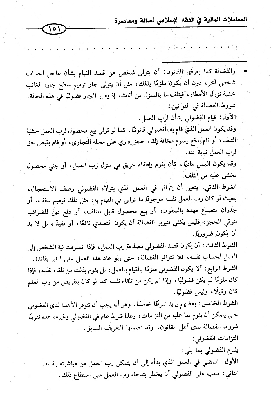 الشرط الخامس: بعضهم يزيد شرطًا خامسًا، وهو أنه يجب أن تتوفر الأهلية لدى الفضولي حتى يتمكن أن يقوم بما عليه من التزامات، وهذا شرط عام في الفضولي وغيره، هذه تقريبًا شروط الفضالة لدى أهل القانون، وقد تضمنها التعريف السابق.