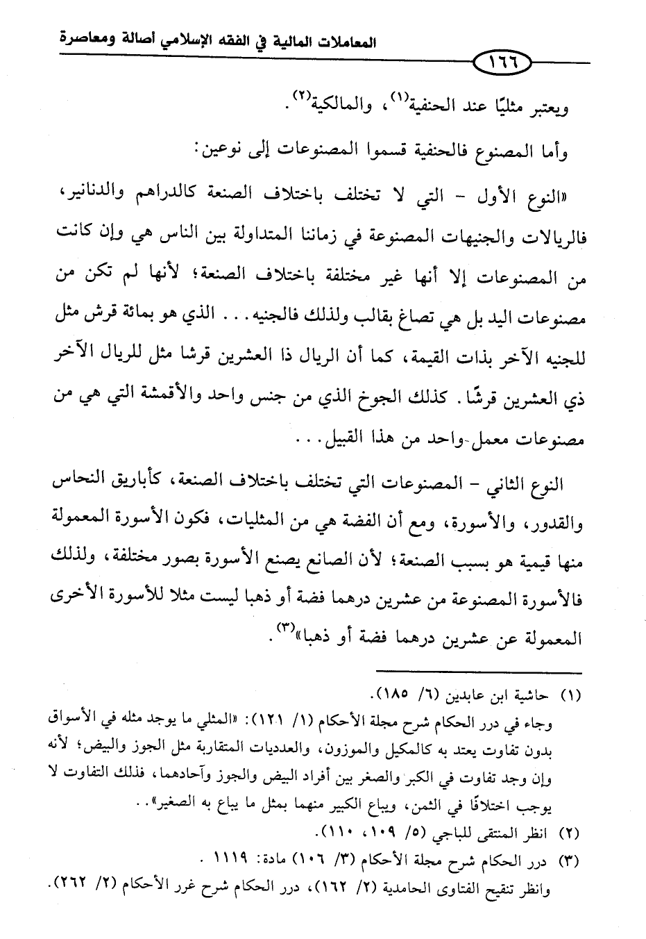 "النوع الأول - التي لا تختلف باختلاف الصنعة كالدراهم والدنانير، فالريالات والجنيهات المصنوعة في زماننا المتداولة بين الناس هي وإن كانت من المصنوعات إلا أنها غير مختلفة باختلاف الصنعة؛ لأنها لم تكن من مصنوعات اليد بل هي تصاغ بقالب ولذلك فالجنيه ... الذي هو بمائة قرش مثل للجنيه الآخر بذات القيمة، كما أن الريال ذا العشرين قرشا مثل للريال الآخر ذي العشرين قرشًا. كذلك الجوخ الذي من جنس واحد والأقمشة التي هي من مصنوعات معمل واحد من هذا القبيل ...