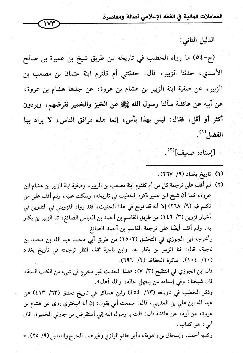 (ح-٥٤) ما رواه الخطيب في تاريخه من طريق شيخ بن عميرة بن صالح الأسدي، حدثنا الزبير، قال: حدثتني أم كلثوم ابنة عثمان بن مصعب بن الزبير، عن صفية ابنة الزبير بن هشام بن عروة، عن جدها هشام بن عروة، عن أبيه عن عائشة سألنا رسول الله - صلى الله عليه وسلم - عن الخبز والخمير نقرضهم، ويردون أكثر أو أقل، فقال: ليس بهذا بأس، إنما هذه مرافق الناس، لا يراد بها الفضل (¬١).