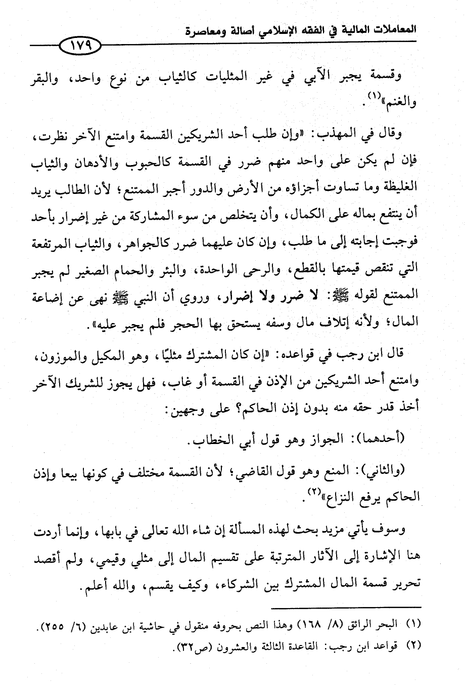 وسوف يأتي مزيد بحث لهذه المسألة إن شاء الله تعالى في بابها، وإنما أردت هنا الإشارة إلى الآثار المترتبة على تقسيم المال إلى مثلي وقيمي، ولم أقصد تحرير قسمة المال المشترك بين الشركاء، وكيف يقسم، والله أعلم.