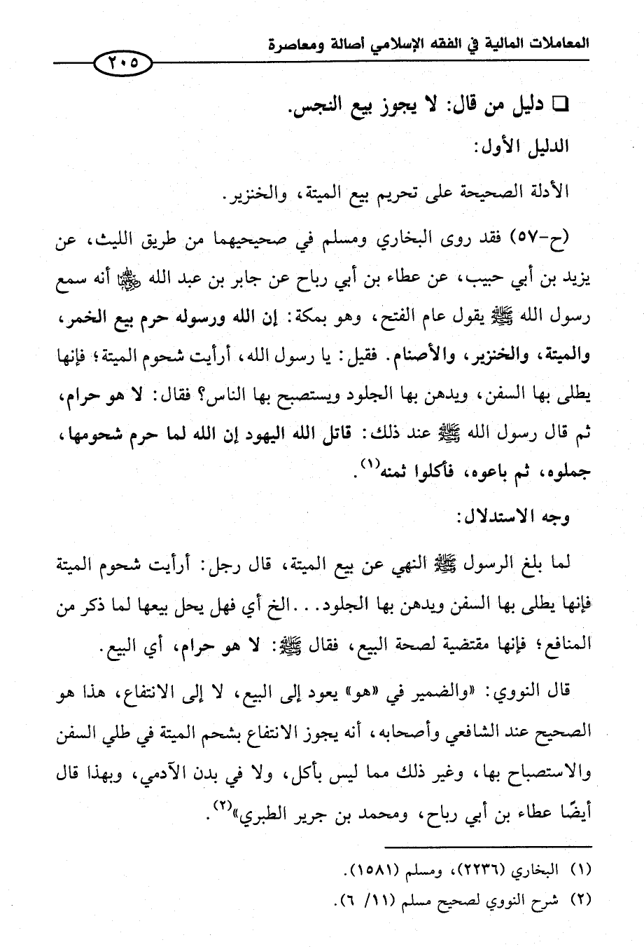 (ح-٥٧) فقد روى البخاري ومسلم في صحيحيهما من طريق الليث، عن يزيد بن أبي حبيب، عن عطاء بن أبي رباح عن جابر بن عبد الله - رضي الله عنهما - أنه سمع رسول الله - صلى الله عليه وسلم - يقول عام الفتح، وهو بمكة: إن الله ورسوله حرم بيع الخمر، والميتة، والخنزير، والأصنام. فقيل: يا رسول الله، أرأيت شحوم الميتة؛ فإنها يطلى بها السفن، ويدهن بها الجلود ويستصبح بها الناس؟ فقال: لا هو حرام، ثم قال رسول الله - صلى الله عليه وسلم - عند ذلك: قاتل الله اليهود إن الله لما حرم شحومها، جملوه، ثم باعوه، فأكلوا ثمنه (¬١).
