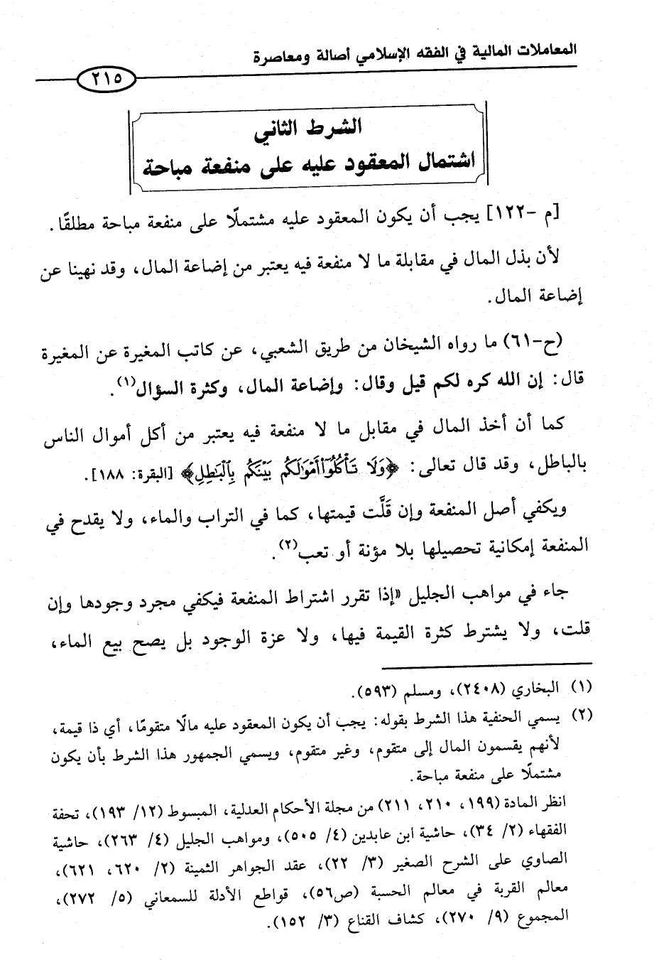 (¬٢) يسمي الحنفية هذا الشرط بقوله: يجب أن يكون المعقود عليه مالاً متقومًا، أي ذا قيمة، لأنهم يقسمون المال إلى متقوم، وغير متقوم، ويسمي الجمهور هذا الشرط بأن يكون مشتملاً على منفعة مباحة.