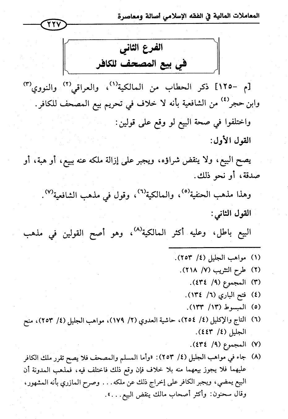 [م - ١٢٥] ذكر الحطاب من المالكية (¬١)، والعراقي (¬٢) والنووي (¬٣) وابن حجر (¬٤) من الشافعية بأنه لا خلاف في تحريم بيع المصحف للكافر.