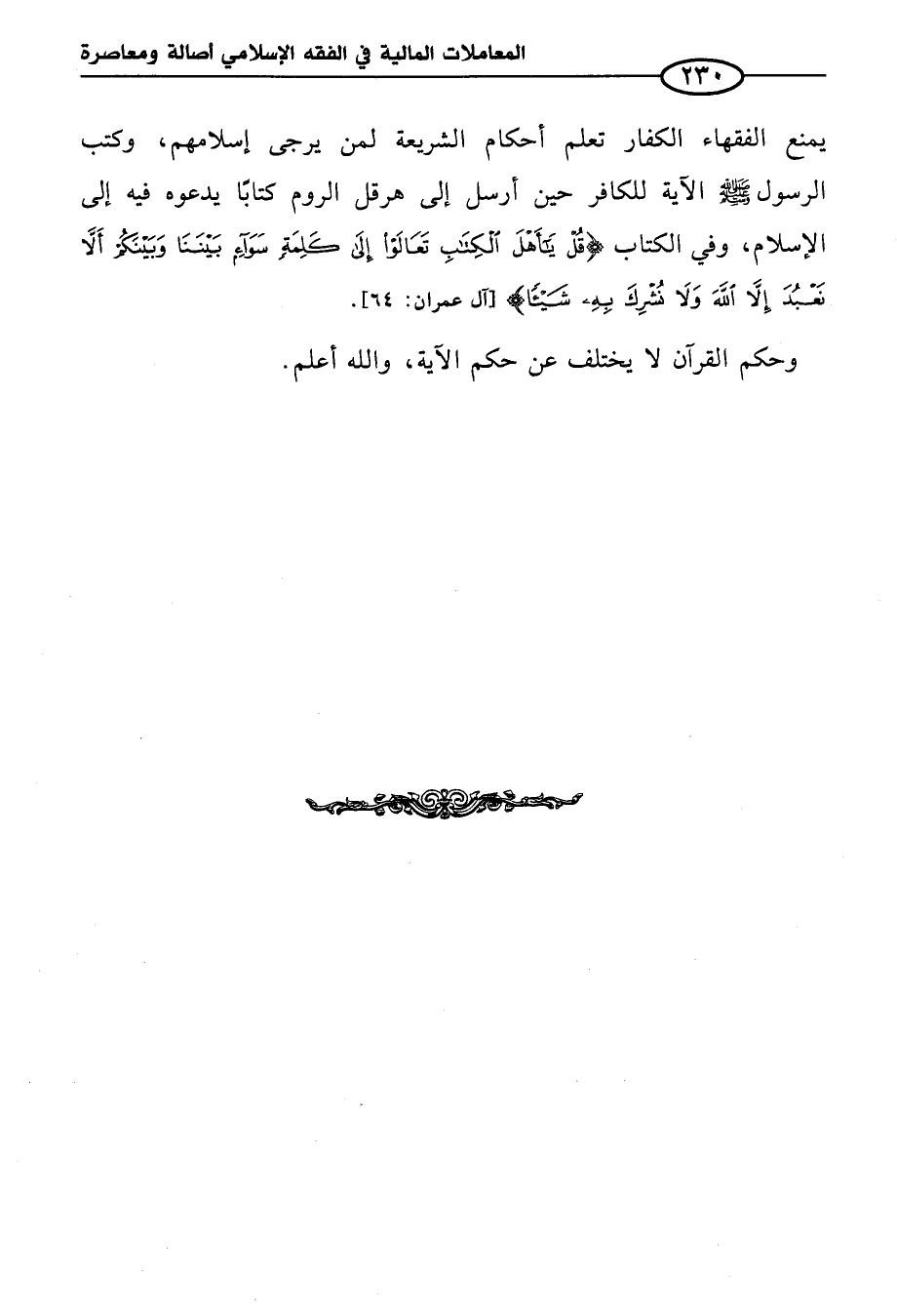 يمنع الفقهاء الكفار تعلم أحكام الشريعة لمن يرجى إسلامهم، وكتب الرسول - صلى الله عليه وسلم - الآية للكافر حين أرسل إلى هرقل الروم كتابًا يدعوه فيه إلى الإِسلام، وفي الكتاب {قُلْ يَا أَهْلَ الْكِتَابِ تَعَالَوْا إِلَى كَلِمَةٍ سَوَاءٍ بَيْنَنَا وَبَيْنَكُمْ أَلَّا نَعْبُدَ إِلَّا اللَّهَ وَلَا نُشْرِكَ بِهِ شَيْئًا} [آل عمران: ٦٤].