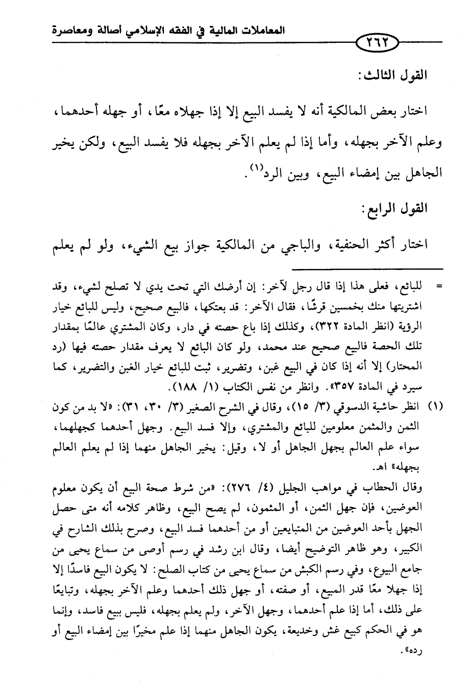 (¬١) انظر حاشية الدسوقي (٣/ ١٥)، وقال في الشرح الصغير (٣/ ٣٠، ٣١): "لا بد من كون الثمن والمثمن معلومين للبائع والمشتري، وإلا فسد البيع. وجهل أحدهما كجهلهما، سواء علم العالم بجهل الجاهل أو لا، وقيل: يخير الجاهل منهما إذا لم يعلم العالم بجهله" اهـ.