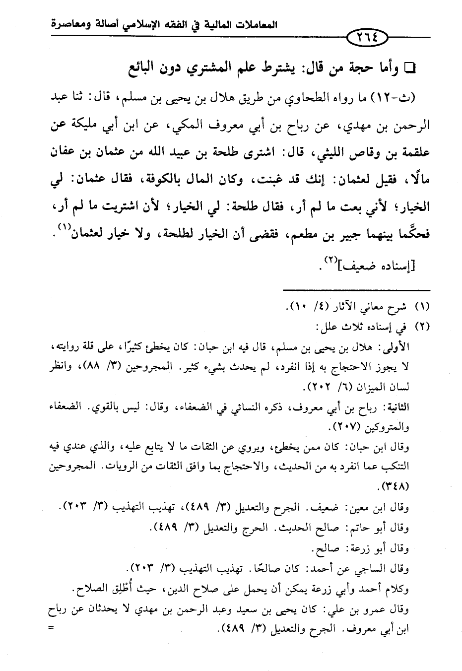 (ث-١٢) ما رواه الطحاوي من طريق هلال بن يحيى بن مسلم، قال: ثنا عبد الرحمن بن مهدي، عن رباح بن أبي معروف المكي، عن ابن أبي مليكة عن علقمة بن وقاعر الليثي، قال: اشترى طلحة بن عبيد الله من عثمان بن عفان مالًا، فقيل لعثمان: إنك قد غبنت، وكان المال بالكوفة، فقال عثمان: لي الخيار؛ لأني بعت ما لم أر، فقال طلحة: لي الخيار؛ لأن اشتريت ما لم أر، فحكَّما بينهما جبير بن مطعم، فقضى أن الخيار لطلحة، ولا خيار لعثمان (¬١).