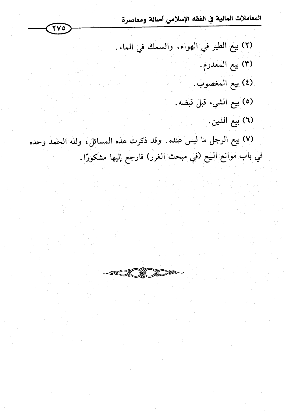 (٧) بيع الرجل ما ليس عنده. وقد ذكرت هذه المسائل، ولله الحمد وحده في باب موانع البيع (في مبحث الغرر) فارجع إليها مشكورًا.