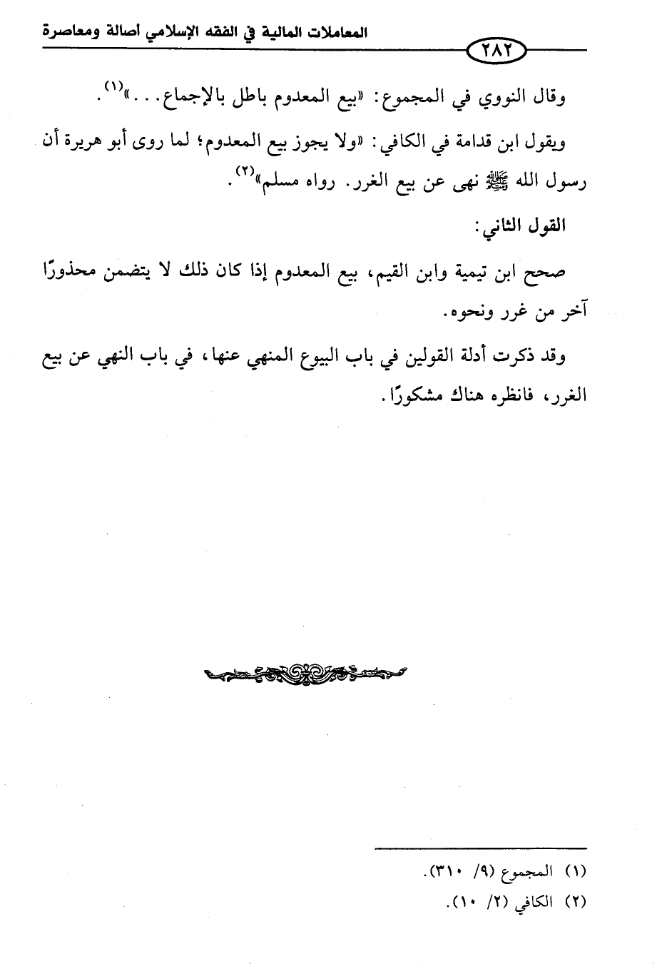 ويقول ابن قدامة في الكافي: "ولا يجوز بيع المعدوم؛ لما روى أبو هريرة أن رسول الله - صلى الله عليه وسلم - نهى عن بيع الغرر. رواه مسلم" (¬٢).