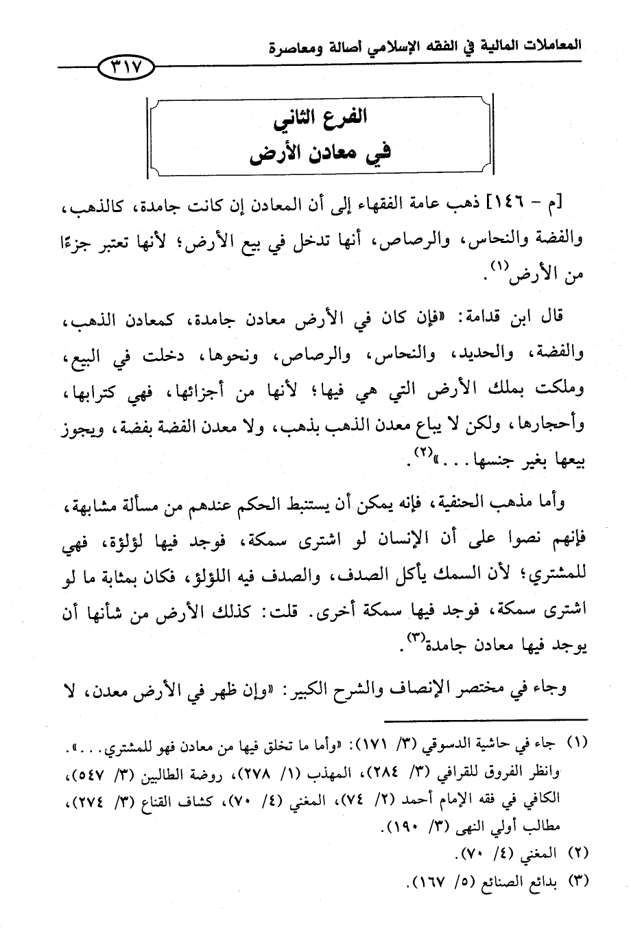 وأما مذهب الحنفية، فإنه يمكن أن يستنبط الحكم عندهم من مسألة مشابهة، فإنهم نصوا على أن الإنسان لو اشترى سمكة، فوجد فيها لؤلؤة، فهي للمشتري؛ لأن السمك يأكل الصدف، والصدف فيه اللؤلؤ، فكان بمثابة ما لو اشترى سمكة، فوجد فيها سمكة أخرى. قلت: كذلك الأرض من شأنها أن يوجد فيها معادن جامدة (¬٣).