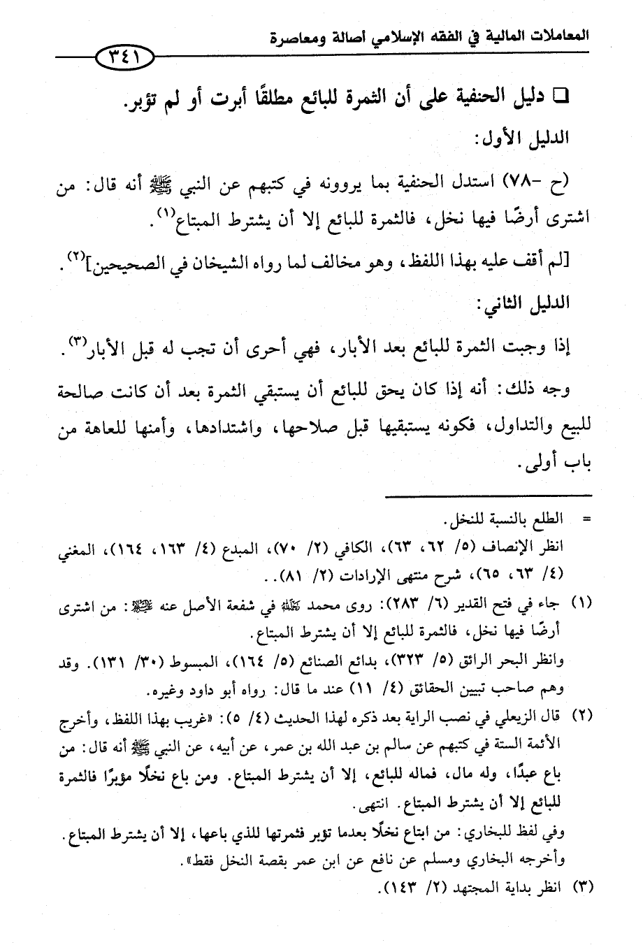 (ح - ٧٨) استدل الحنفية بما يروونه في كتبهم عن النبي - صلى الله عليه وسلم - أنه قال: من اشترى أرضًا فيها نخل، فالثمرة للبائع إلا أن يشترط المبتاع (¬١).