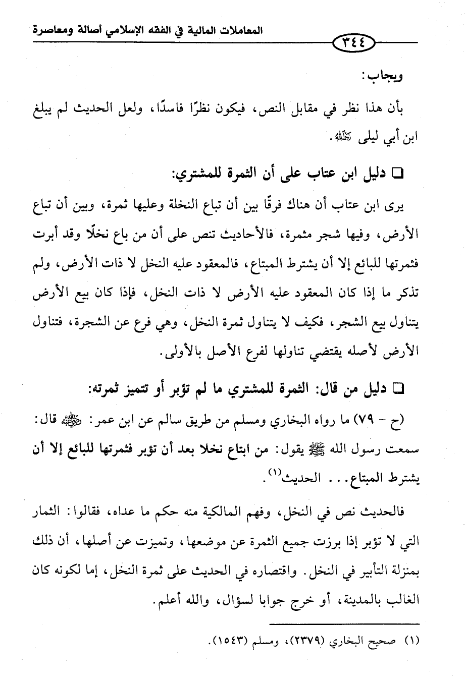 (ح - ٧٩) ما رواه البخاري ومسلم من طريق سالم عن ابن عمر: - رضي الله عنه - قال: سمعت رسول الله - صلى الله عليه وسلم - يقول: من ابتاع نخلا بعد أن تؤبر فثمرتها للبائع إلا أن يشترط المبتاع ... الحديث (¬١).