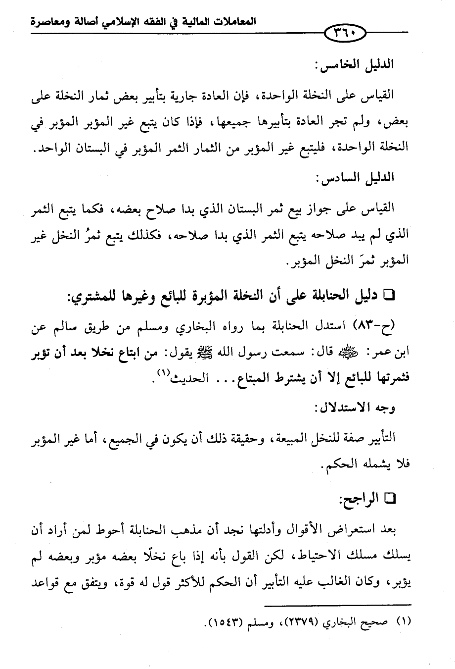 (ح - ٨٣) استدل الحنابلة بما رواه البخاري ومسلم من طريق سالم عن ابن عمر: - رضي الله عنه - قال: سمعت رسول الله - صلى الله عليه وسلم - يقول: من ابتاع نخلا بعد أن تؤبر فثمرتها للبائع إلا أن يشترط المبتاع ... الحديث (¬١).