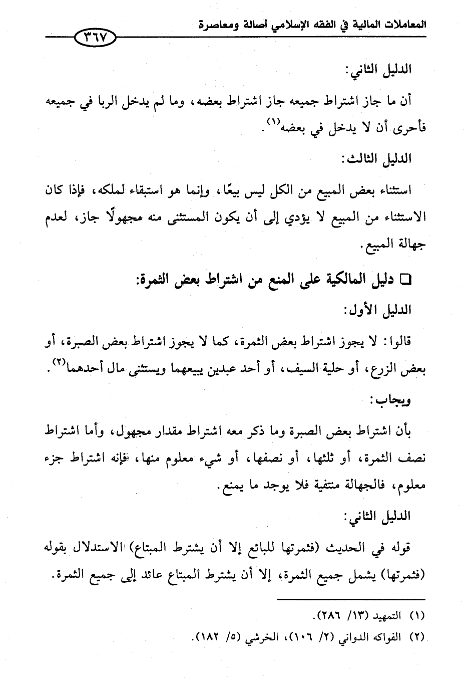 قالوا: لا يجوز اشتراط بعض الثمرة، كما لا يجوز اشتراط بعض الصبرة، أو بعض الزرع، أو حلية السيف، أو أحد عبدين يبيعهما ويستثنى مال أحدهما (¬٢).
