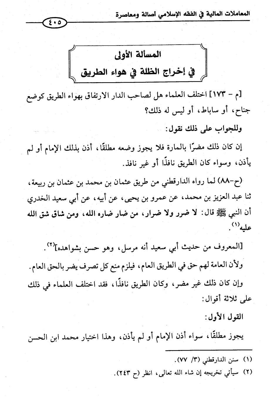 [م - ١٧٣] اختلف العلماء هل لصاحب الدار الارتفاق بهواء الطريق كوضع جناح، أو ساباط، أو ليس له ذلك؟