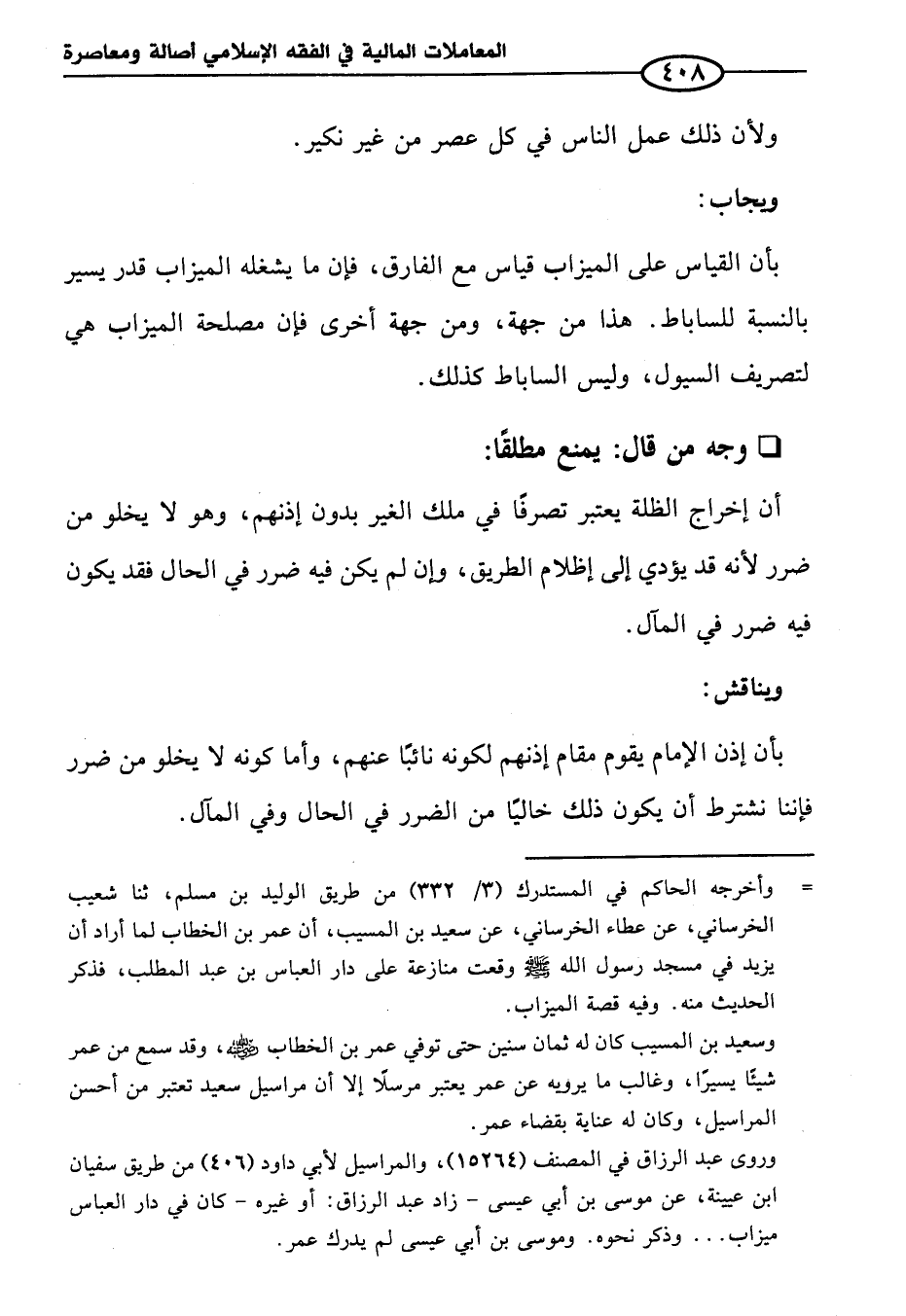 بأن القياس على الميزاب قياس مع الفارق، فإن ما يشغله الميزاب قدر يسير بالنسبة للساباط. هذا من جهة، ومن جهة أخرى فإن مصلحة الميزاب هي لتصريف السيول، وليس الساباط كذلك.