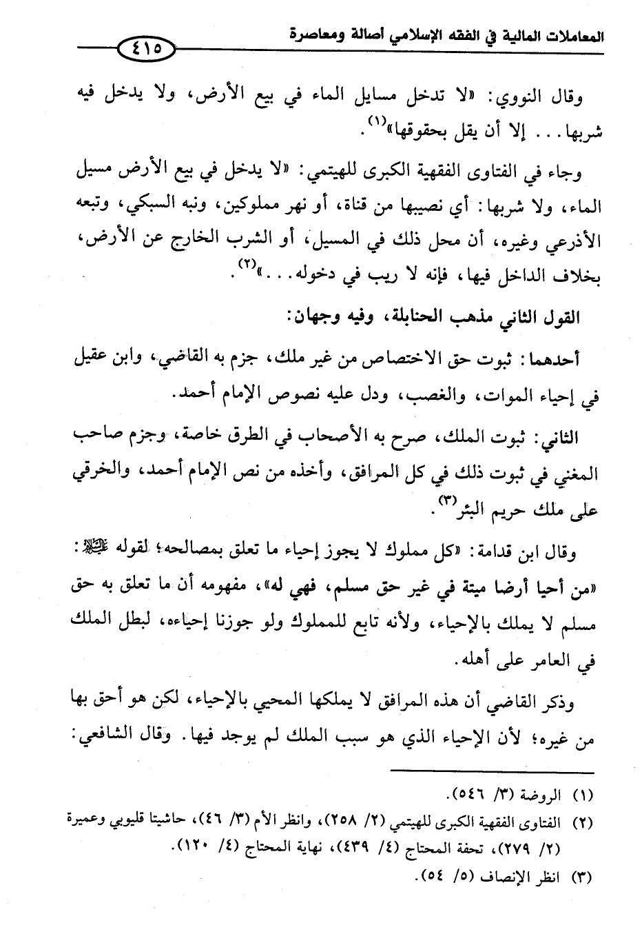 وقال ابن قدامة: "كل مملوك لا يجوز إحياء ما تعلق بمصالحه؛ لقوله - عليه السلام -: "من أحيا أرضا ميتة في غير حق مسلم، فهي له"، مفهومه أن ما تعلق به حق مسلم لا يملك بالإحياء، ولأنه تابع للمملوك ولو جوزنا إحياءه، لبطل الملك في العامر على أهله.