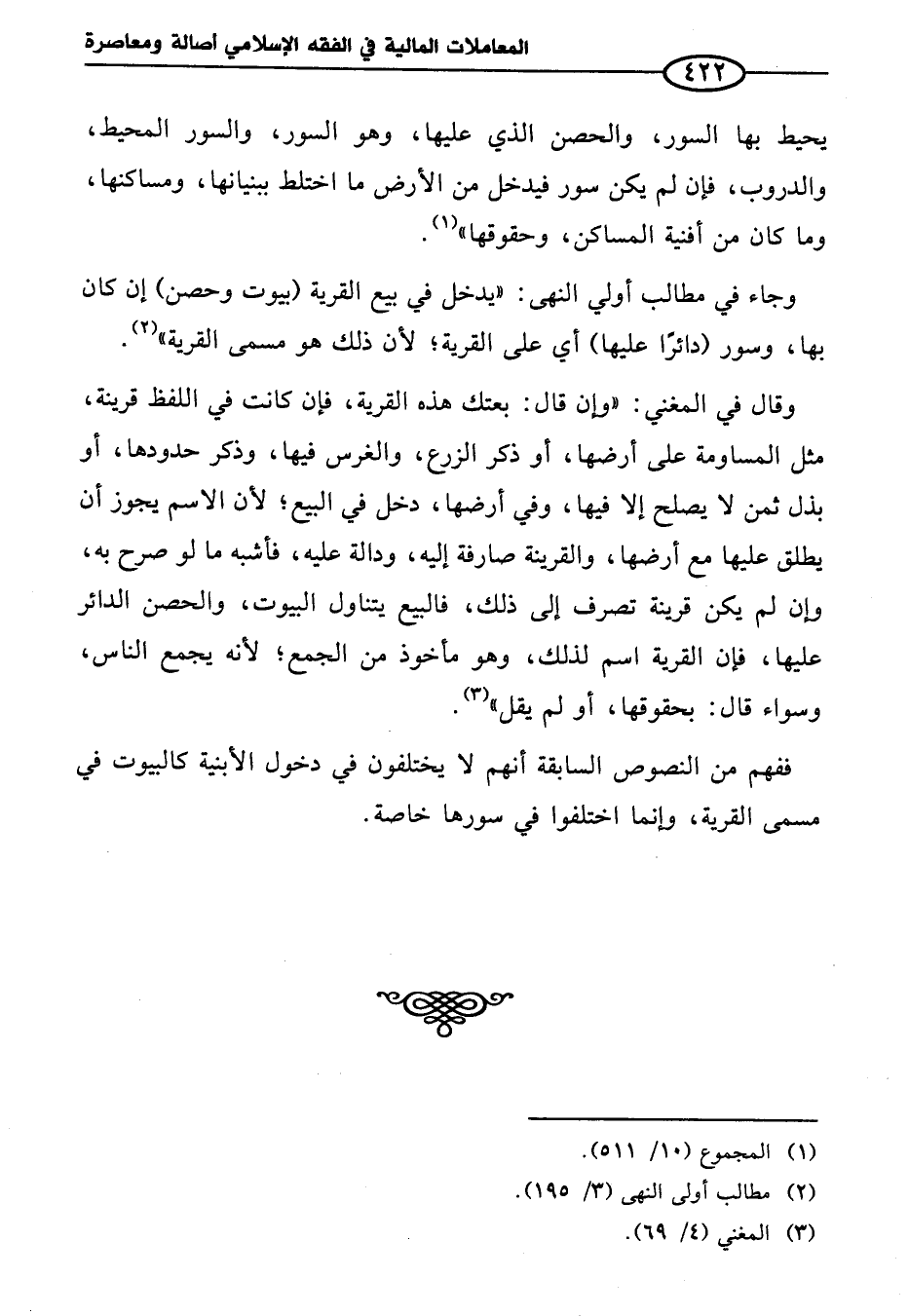 وجاء في مطالب أولي النهى: "يدخل في بيع القرية (بيوت وحصن) إن كان بها، وسور (دائرًا عليها) أي على القرية؛ لأن ذلك هو مسمى القرية" (¬٢).