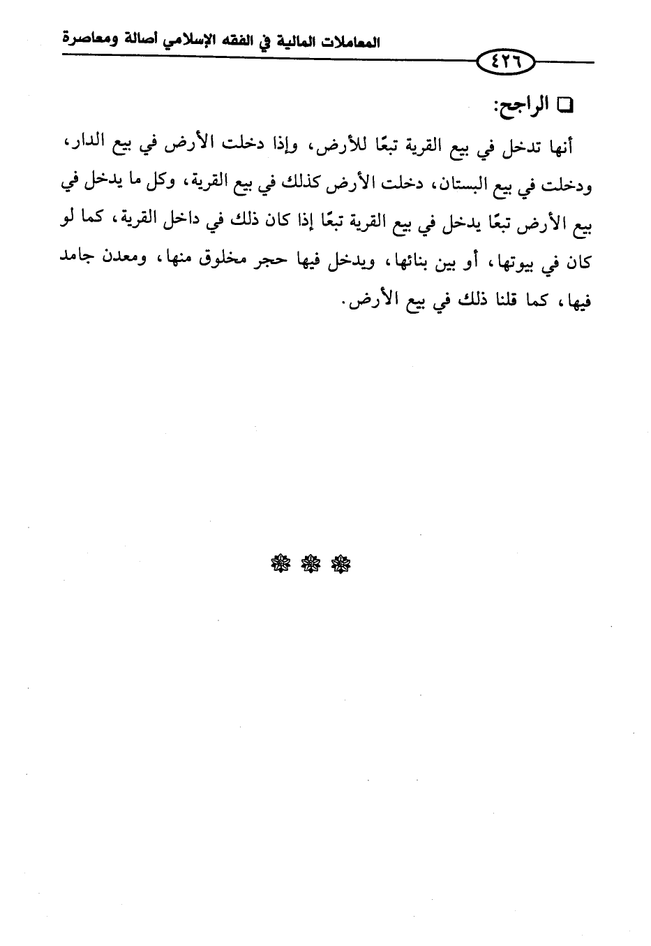 أنها تدخل في بيع القرية تبعًا للأرض، وإذا دخلت الأرض في بيع الدار، ودخلت في بيع البستان، دخلت الأرض كذلك في بيع القرية، وكل ما يدخل في بيع الأرض تبعًا يدخل في بيع القرية تبعًا إذا كان ذلك في داخل القرية، كما لو كان في بيوتها، أو بين بنائها، ويدخل فيها حجر مخلوق منها، ومعدن جامد فيها، كما قلنا ذلك في بيع الأرض.
