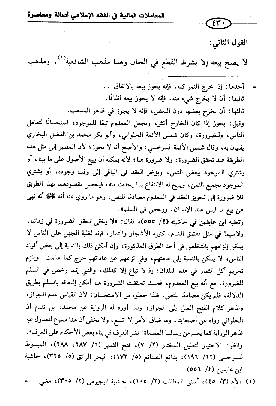 وتعقبه بن عابدين في حاشيته (٤/ ٥٥٥)، فقال: "لا يخفى تحقق الضرورة في زماننا، ولاسيما في مثل دمشق الشام، كثيرة الأشجار والثمار، فإنه لغلبة الجهل على الناس لا يمكن إلزامهم بالتخلص في أحد الطرق المذكورة، وإن أمكن ذلك بالنسبة إلى بعض أفراد الناس، لا يمكن بالنسبة إلى عامتهم، وفي نزعهم عن عاداتهم حرج كما علمت. ويلزم تحريم أكل الثمار في هذه البلدان؛ إذ لا تباع إلا كذلك، والنبي إنما رخص في السلم للضرورة، مع أنه بيع المعدوم، فحيث تحققت الضرورة هنا أمكن إلحاقه بالسلم بطريق الدلالة، فلم يكن مصادمًا للنص، فلذا جعلوه من الاستحسان؛ لأن القياس عدم الجواز، وظاهر كلام الفتح الميل إلى الجواز، ولذا أورد له الرواية عن محمَّد، بل تقدم أن الحلواني رواه عن أصحابنا، وما ضاق الأمر إلا اتسع، ولا يخفى أن هذا مسوغ للعدول عن ظاهر الرواية كما يعلم من رسالتنا المسماة: نشر العرف في بناء بعض الأحكام على العرف". وانظر: الاختيار لتعليل المختار (٢/ ٧)، فتح القدير (٦/ ٢٨٧، ٢٨٨)، المبسوط للسرخسي (١٢/ ١٩٦)، بدائع الصنائع (٥/ ١٧٢)، البحر الرائق (٥/ ٣٢٥)، حاشية ابن عابدين (٤/ ٥٥٦).