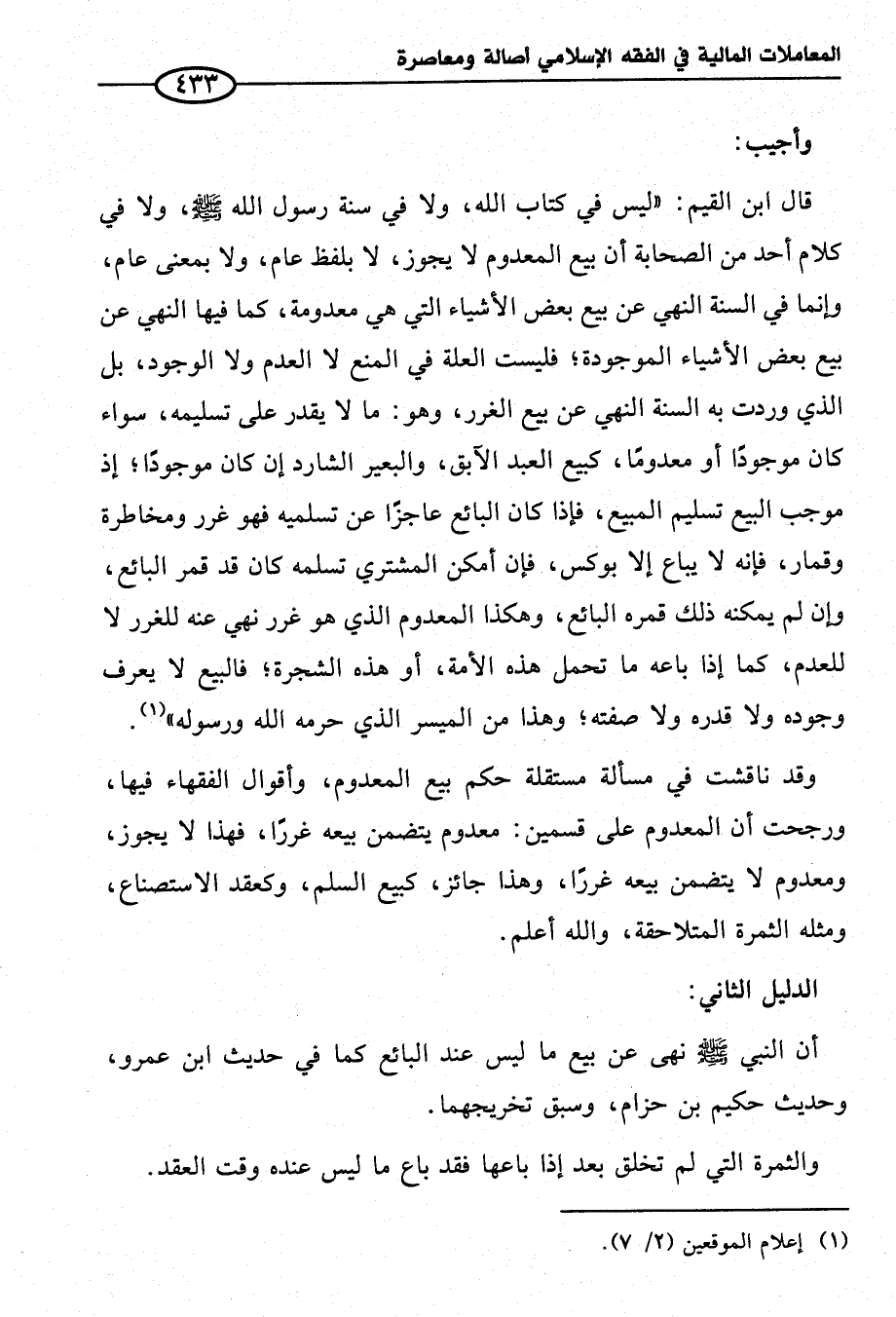 قال ابن القيم: "ليس في كتاب الله، ولا في سنة رسول الله - صلى الله عليه وسلم -، ولا في كلام أحد من الصحابة أن بيع المعدوم لا يجوز، لا بلفظ عام، ولا بمعنى عام، وإنما في السنة النهي عن بيع بعض الأشياء التي هي معدومة، كما فيها النهي عن بيع بعض الأشياء الموجودة؛ فليست العلة في المنع لا العدم ولا الوجود، بل الذي وردت به السنة النهي عن بيع الغرر، وهو: ما لا يقدر على تسليمه، سواء كان موجودًا أو معدومًا، كبيع العبد الآبق، والبعير الشارد إن كان موجودًا؛ إذ موجب البيع تسليم المبيع، فإذا كان البائع عاجزًا عن تسلميه فهو غرر ومخاطرة وقمار، فإنه لا يباع إلا بوكس، فإن أمكن المشتري تسلمه كان قد قمر البائع، وإن لم يمكنه ذلك قمره البائع، وهكذا المعدوم الذي هو غرر نهي عنه للغرر لا للعدم، كما إذا باعه ما تحمل هذه الأمة، أو هذه الشجرة؛ فالبيع لا يعرف وجوده ولا قدره ولا صفته؛ وهذا من الميسر الذي حرمه الله ورسوله" (¬١).