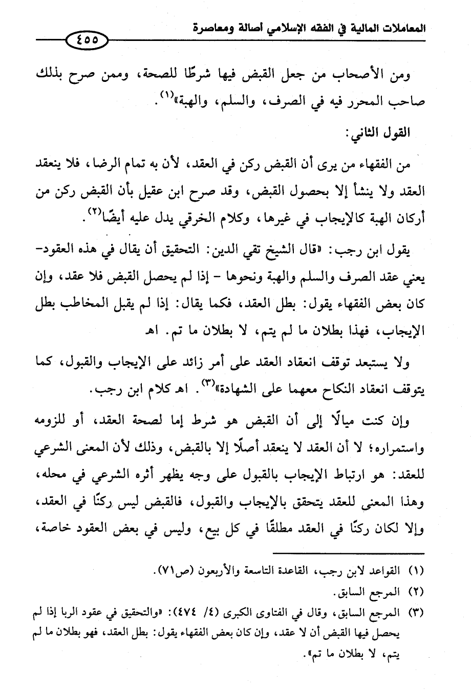 وإن كنت ميالًا إلى أن القبض هو شرط إما لصحة العقد، أو للزومه واستمراره؛ لا أن العقد لا ينعقد أصلاً إلا بالقبض، وذلك لأن المعنى الشرعي للعقد: هو ارتباط الإيجاب بالقبول على وجه يظهر أثره الشرعي في محله، وهذا المعنى للعقد يتحقق بالإيجاب والقبول، فالقبض ليس ركنًا في العقد، وإلا لكان ركنًا في العقد مطلقًا في كل بيع، وليس في بعض العقود خاصة،