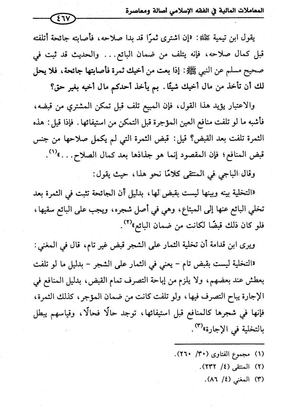يقول ابن تيمية - رحمه الله -: "إن اشترى ثمرًا قد بدا صلاحه، فأصابته جائحة أتلفته قبل كمال صلاحه، فإنه يتلف من ضمان البائع ... والحديث قد ثبت في صحيح مسلم عن النبي - صلى الله عليه وسلم -: إذا بعت من أخيك ثمرة فأصابتها جائحة، فلا يحل لك أن تأخذ من مال أخيك شيئاً. بم يأخذ أحدكم مال أخيه بغير حق؟