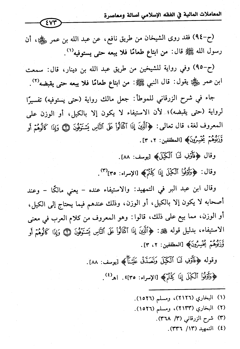 وقال ابن عبد البر في التمهيد: والاستيفاء عنده -يعني مالكًا- وعند أصحابه لا يكون إلا بالكليل، أو الوزن، وذلك عندهم فيما يحتاج إلى الكيل، أو الوزن، مما بيع على ذلك، قالوا: وهو المعروف من كلام العرب في معنى الاستيفاء، بدليل قوله عز وجل: {الَّذِينَ إِذَا اكْتَالُوا عَلَى النَّاسِ يَسْتَوْفُونَ (٢) وَإِذَا كَالُوهُمْ أَوْ وَزَنُوهُمْ يُخْسِرُونَ (٣)} [المطففين: ٢، ٣].