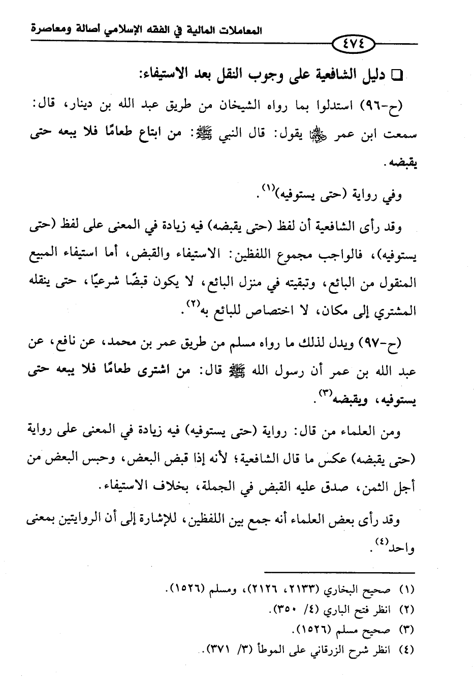 (ح-٩٧) ويدل لذلك ما رواه مسلم من طريق عمر بن محمَّد، عن نافع، عن عبد الله بن عمر أن رسول الله - صلى الله عليه وسلم - قال: من اشترى طعامًا فلا يبعه حتى يستوفيه، ويقبضه (¬٣).