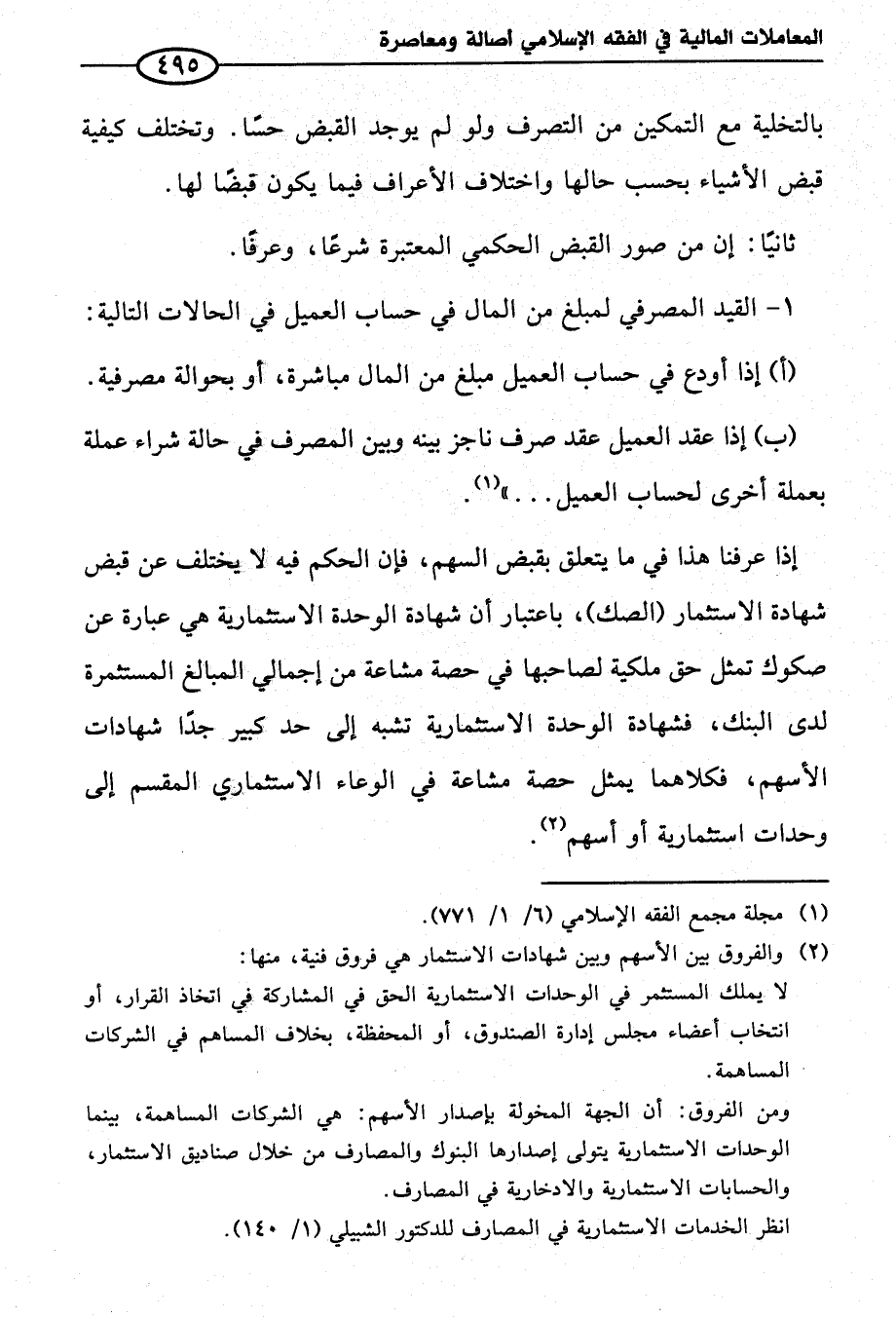 إذا عرفنا هذا في ما يتعلق بقبض السهم، فإن الحكم فيه لا يختلف عن قبض شهادة الاستثمار (الصك)، باعتبار أن شهادة الوحدة الاستثمارية هي عبارة عن صكوك تمثل حق ملكية لصاحبها في حصة مشاعة من إجمالي المبالغ المستثمرة لدى البنك، فشهادة الوحدة الاستثمارية تشبه إلى حد كبير جدًا شهادات الأسهم، فكلاهما يمثل حصة مشاعة في الوعاء الاستثماري المقسم إلى وحدات استثمارية أو أسهم (¬٢).