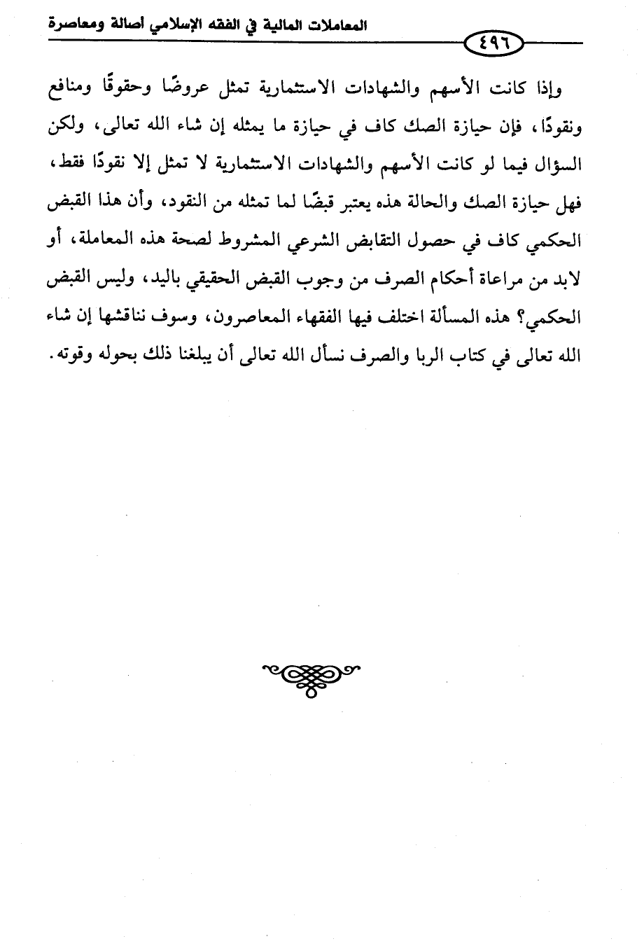 وإذا كانت الأسهم والشهادات الاستثمارية تمثل عروضًا وحقوقًا ومنافع ونقودًا، فإن حيازة الصك كاف في حيازة ما يمثله إن شاء الله تعالى، ولكن السؤال فيما لو كانت الأسهم والشهادات الاستثمارية لا تمثل إلا نقودًا فقط، فهل حيازة الصك والحالة هذه يعتبر قبضًا لما تمثله من النقود، وأن هذا القبض الحكمي كاف في حصول التقابض الشرعي المشروط لصحة هذه المعاملة، أو لا بد من مراعاة أحكام الصرف من وجوب القبض الحقيقي باليد، وليس القبض الحكمي؟ هذه المسألة اختلف فيها الفقهاء المعاصرون، وسوف نناقشها إن شاء الله تعالى في كتاب الربا والصرف نسأل الله تعالى أن يبلغنا ذلك بحوله وقوته.