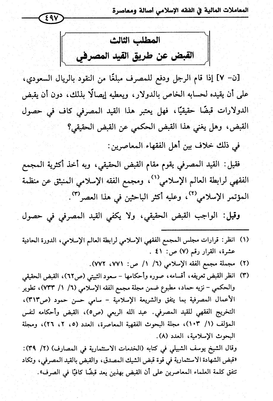 (¬٣) انظر القبض تعريفه، أقسامه، صوره وأحكامها - سعود الثبيتي (ص ٦٢)، القبض الحقيقي والحكمي - نزيه حماد، مطبوع ضمن مجلة مجمع الفقه الإِسلامي (٦/ ١/ ٧٣٣)، تطوير الأعمال المصرفية بما يتفق والشريعة الإِسلامية - سامي حسن حمود (ص ٣١٣)، التخريج الفقهي للقيد المصرفي. عبد الله الربعي (ص ٥)، القبض وأحكامه لنفس المؤلف (١/ ١٠٣)، مجلة البحوث الفقهية المعاصرة، العدد (٥، ٢، ٢٦)، ومجلة البحوث الإِسلامية، العدد (٨).