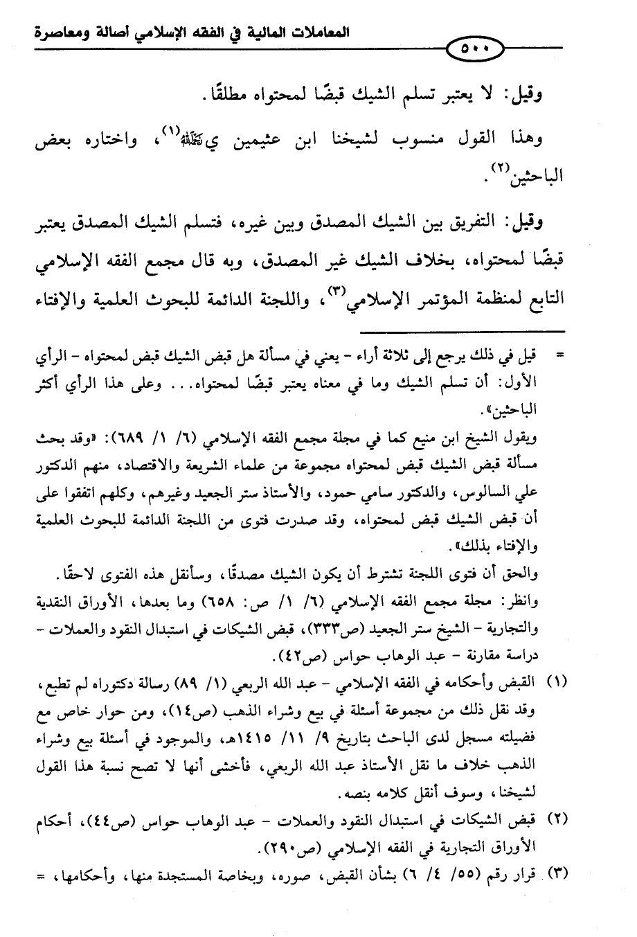 (¬١) القبض وأحكامه في الفقه الإِسلامي - عبد الله الربعي (١/ ٨٩) رسالة دكتوراه لم تطبع، وقد نقل ذلك من مجموعة أسئلة في بيع وشراء الذهب (ص ١٤)، ومن حوار خاص مع فضيلته مسجل لدى الباحث بتاريخ ٩/ ١١/ ١٤١٥ هـ