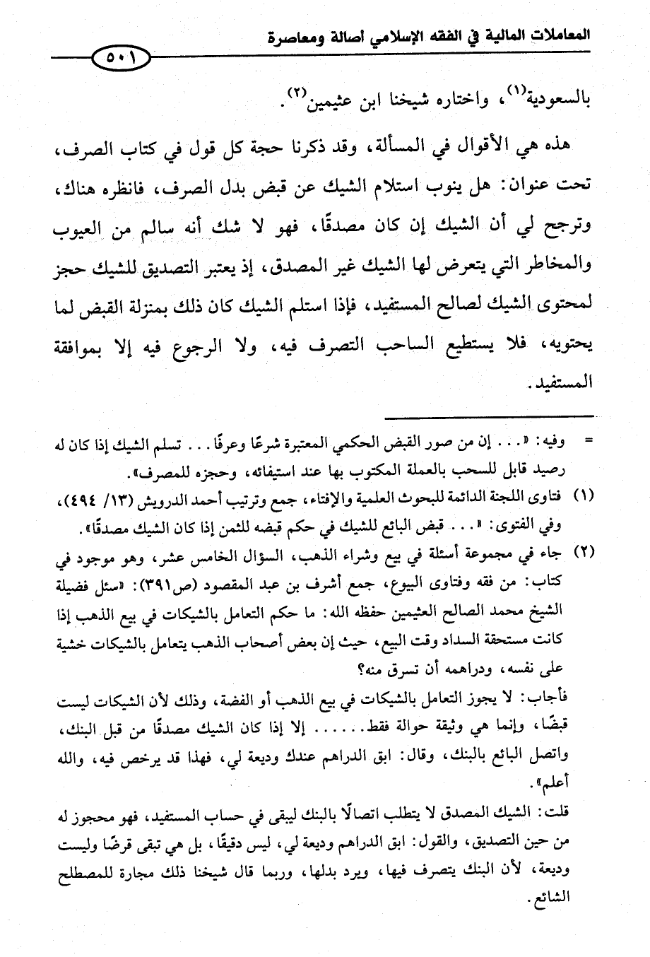 (¬٢) جاء في مجموعة أسئلة في بيع وشراء الذهب، السؤال الخامس عشر، وهو موجود في كتاب: من فقه وفتاوى البيوع، جمع أشرف بن عبد المقصود (ص٣٩١): "سئل فضيلة الشيخ محمَّد الصالح العثيمين حفظه الله: ما حكم التعامل بالشيكات في بيع الذهب إذا كانت مستحقة السداد وقت البيع، حيث إن بعض أصحاب الذهب يتعامل بالشيكات خشية على نفسه، ودراهمه أن تسرق منه؟