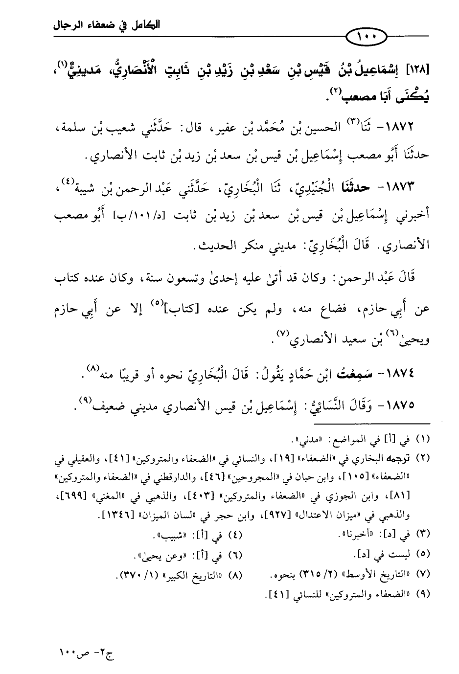 1873 - حَدثنا الجنيدي، حَدثنا البُخاري، حَدَّثني عَبد الرحمن بن شيبة، أخبرني إسماعيل بن قيس بن سعد بن زيد بن ثابت أَبو مصعب الأنصاري. قال البُخاري: مديني منكر الحديث.