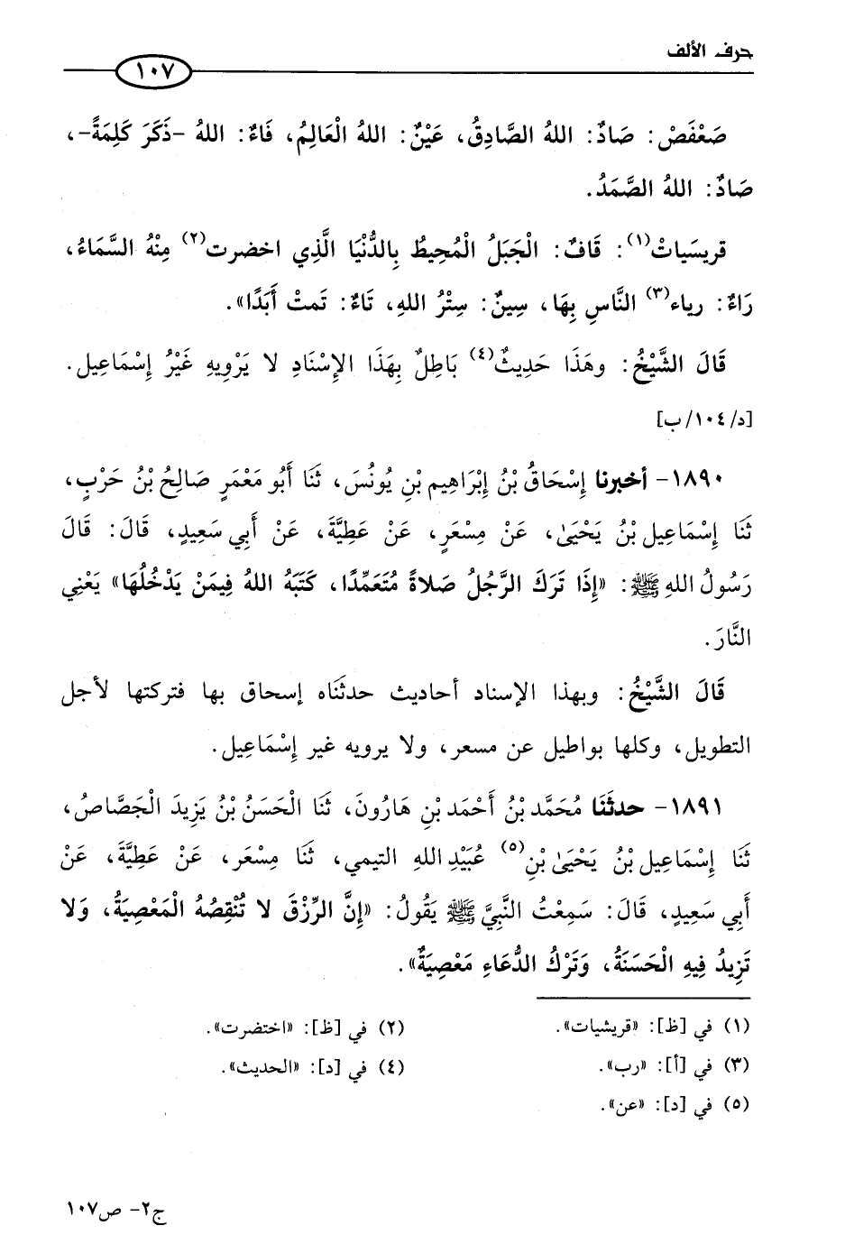 1890 - أخبرنا إسحاق بن إبراهيم بن يُونُس، حَدثنا أَبو معمر صالح بن حرب، حَدثنا إسماعيل بن يَحيى، عن مسعر، عن عطية، عن أبي سعيد، قال: قال رسول الله صَلى الله عَليه وسَلم: إذا ترك الرجل صلاة متعمدا، كتبه الله فيمن يدخلها، يعني النار.