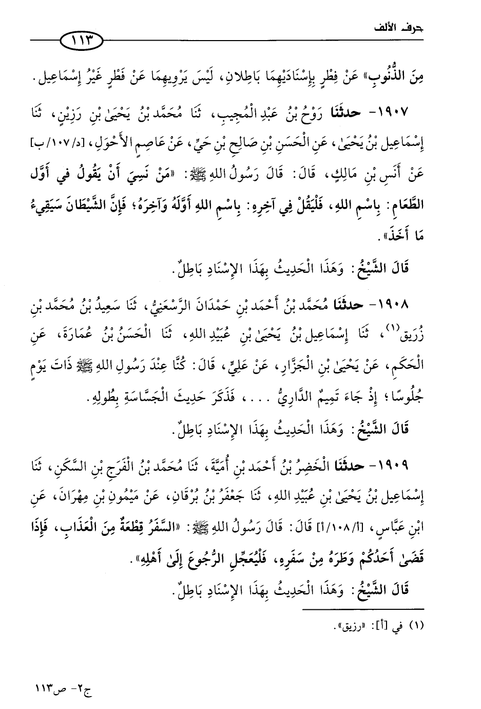 قال الشيخ: وهذا الحديث بهذا الإسناد باطل.