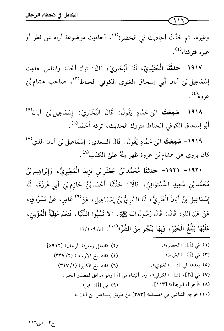 1919 - سمعتُ ابن حماد يقول: قال السعدي: إسماعيل بن أَبَان الذي كان يروي عن هشام بن عروة، ظهر منه على الكذب.