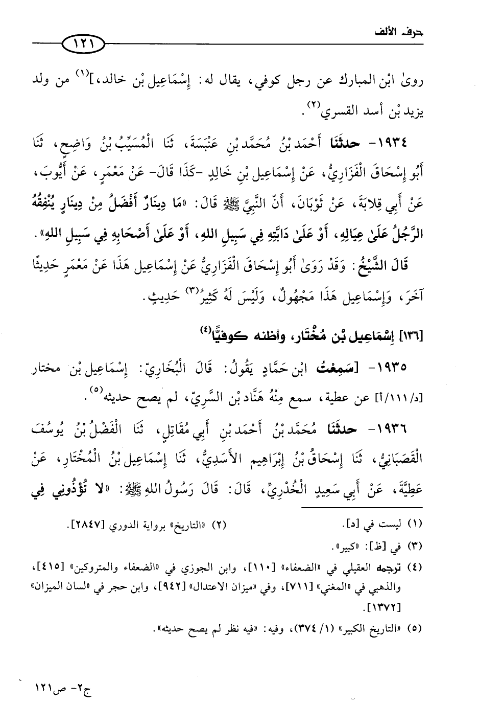 1935 - سمعتُ ابن حماد يقول: قال البُخاري: إسماعيل بن مختار، عن عطية، سمع منه هناد بن السري، لم يصح حديثه.