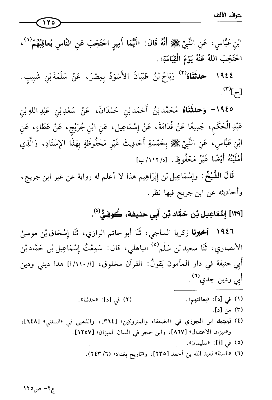 1946 - أخبرنا زكريا الساجي، حَدثنا أَبو حاتم الرازي، حَدثنا إسحاق بن موسى الأنصاري، حَدثنا سعيد بن سلم الباهلي، قال: سمعتُ إسماعيل بن حماد بن أبي حنيفة في دار المأمون يقول: القرآن مخلوق، هذا ديني ودين أبي، ودين جدي.