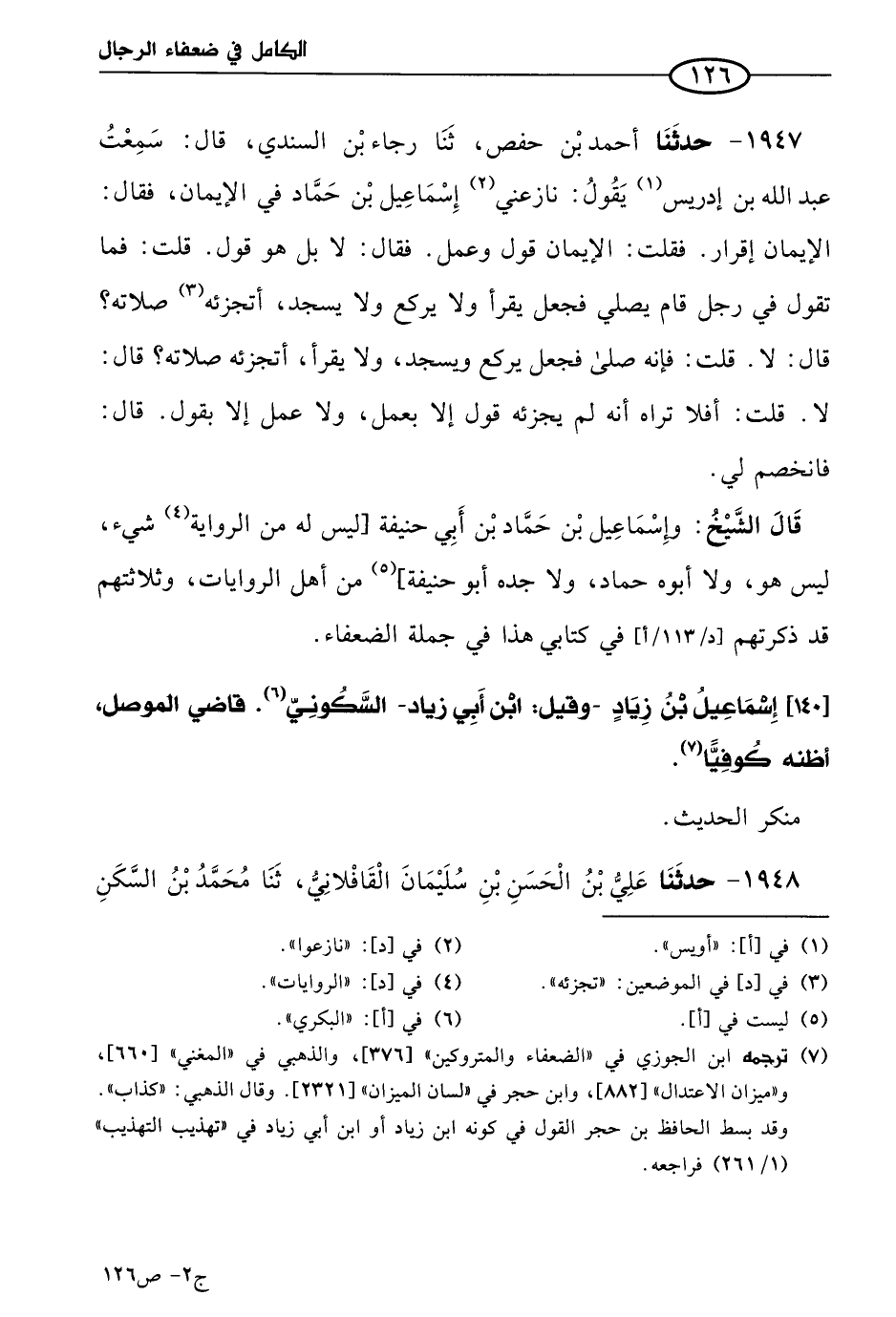 1947 - حَدثنا أحمد بن حفص، حَدثنا رجاء بن السندي، قال: سمعت عبد الله بن إدريس يقول: نازعني إسماعيل بن حماد في الإيمان، فقال: الإيمان إقرار، فقلت: الإيمان قول وعمل؟ فقال: لاَ، بل هو قول، قلت: فما تقول في رجل قام يصلي فجعل يقرأ، ولا يركع ولا يسجد، أتجزئه صلاته؟ قال: لاَ، قلت: فإنه صلى فجعل يركع ويسجد، ولا يقرأ، أتجزئه صلاته؟ قال: لاَ، قلت: أفلا تراه أنه لم يجزئه قول إلا بعمل، ولا عمل إلا بقول؟ قال: فانخصم لي.