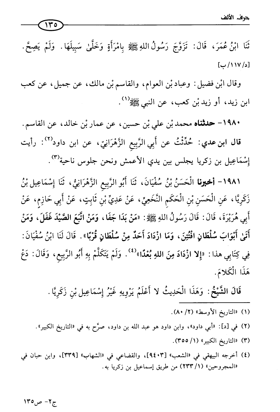 1981 - أخبرنا الحسن بن سفيان، حَدثنا أَبو الربيع الزهراني، حَدثنا إسماعيل بن زكريا، عن الحسن بن الحكم النخعي، عن عدي بن ثابت، عن أبي حازم، عن أبي هريرة، قال: قال رسول الله صَلى الله عَليه وسَلم: من بدا جفا، ومن اتبع الصيد غفل، ومن أتى أبواب سلطان افتُتن، وما ازداد أحد من سلطان قربا.