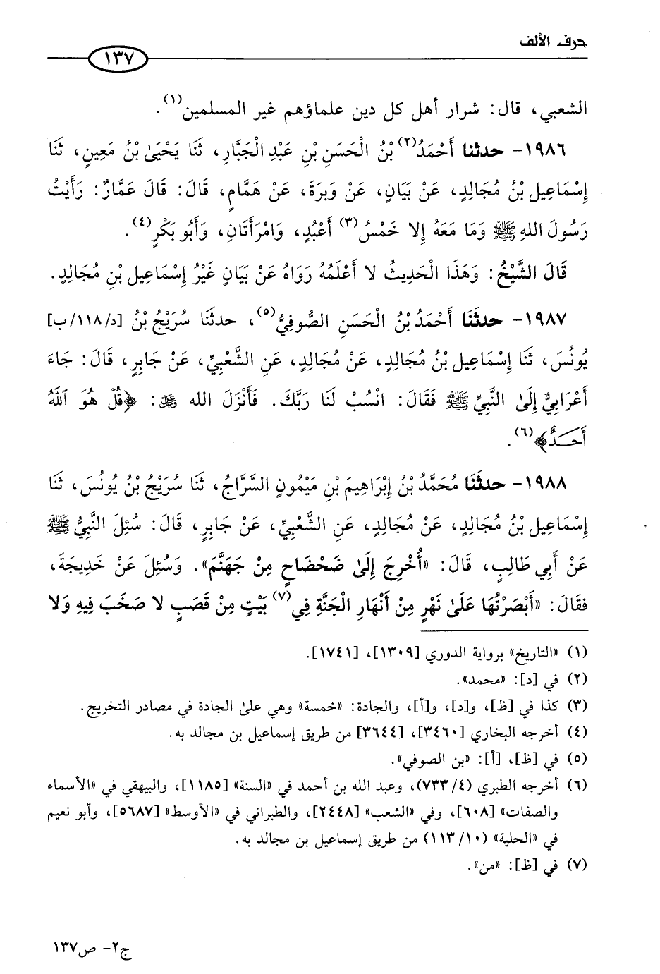 1987 - حَدثنا أحمد بن الحسن الصُّوفي، حَدثنا سريج بن يُونُس، حَدثنا إسماعيل بن مجالد، عن مجالد، عن الشعبي، عن جابر قال: جاء أعرابي إلى النبي صَلى الله عَليه وسَلم فقال: انسب لنا ربك، فأنزل الله عَزّ وجَلَّ: {قلْ هُو الله أَحَدٌ}.