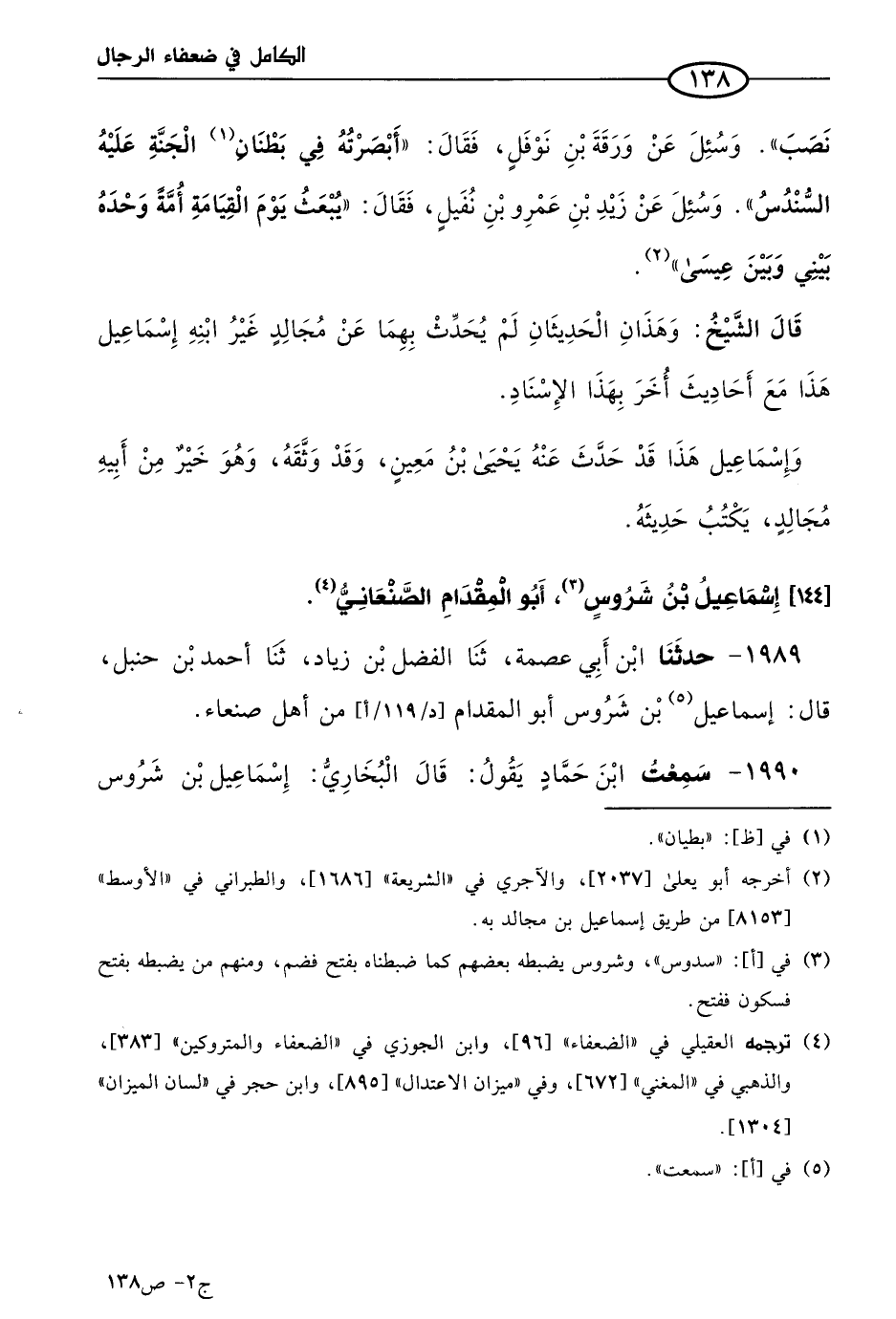 1989 - حَدثنا ابن أبي عصمة، حَدثنا الفضل بن زياد، حَدثنا أحمد بن حنبل قال: إسماعيل بن شروس أَبو المقدام من أهل صنعاء.