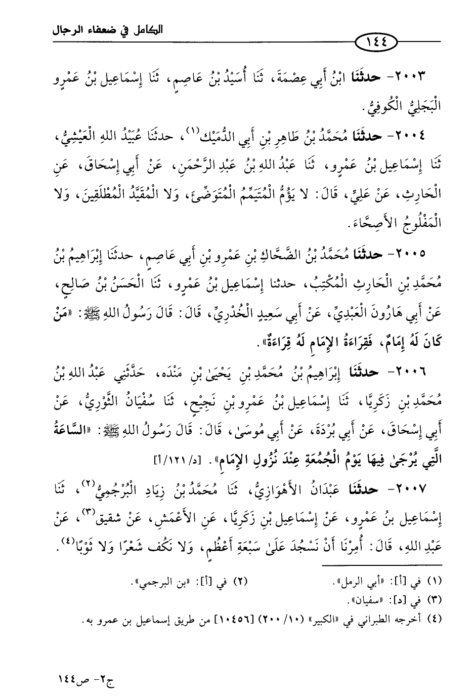 2007 - حَدثنا عبدان الأهوازي، حَدثنا مُحمد بن زياد البرجمي، حَدثنا إسماعيل بن عَمرو، عن إسماعيل بن زكريا، عن الأَعمَش، عن شقيق، عن عَبد الله قال: أُمِرْنَا أن نسجد على سبعة أعظم، ولا نكف شعرا، ولا ثوبا.