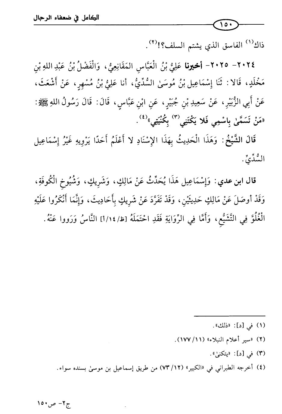 2024 - 2025 - أخبرنا علي بن العباس المقانعي، والفضل بن عَبد الله بن مخلد، قالا: حَدثنا إسماعيل بن موسى السدي، أخبرنا علي بن مسهر، عن أشعث، عن أبي الزبير، عن سعيد بن جُبَير، عن ابن عباس، قال: قال رسول الله صَلى الله عَليه وسَلم: من تسمى باسمي، فلا يكتني بكنيتي.